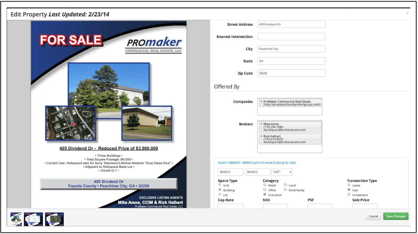 商业地产传单示例及手动录入的房源信息 © ProMaker Commercial Real Estate LLC, © BrokerSavant Inc.