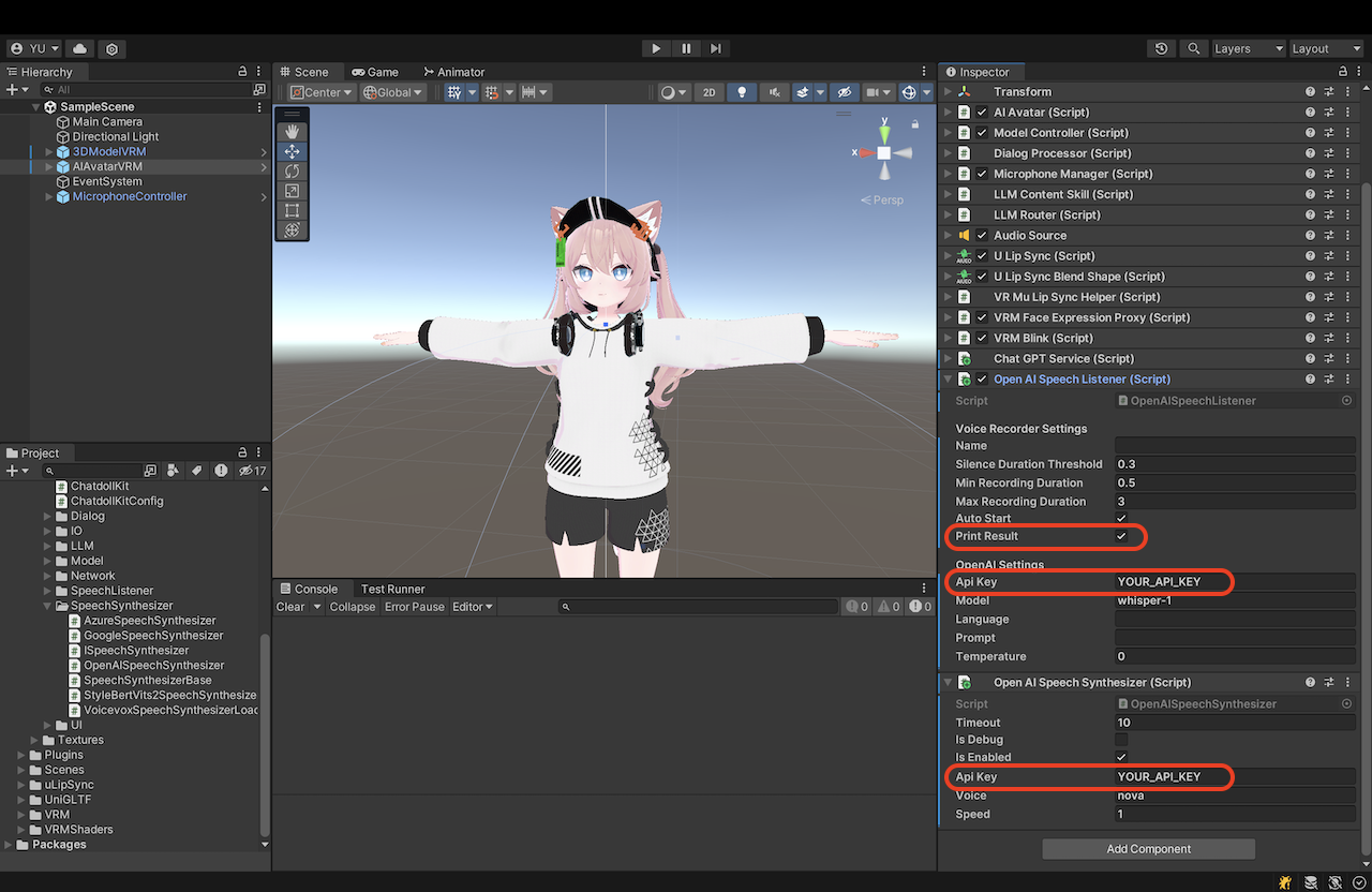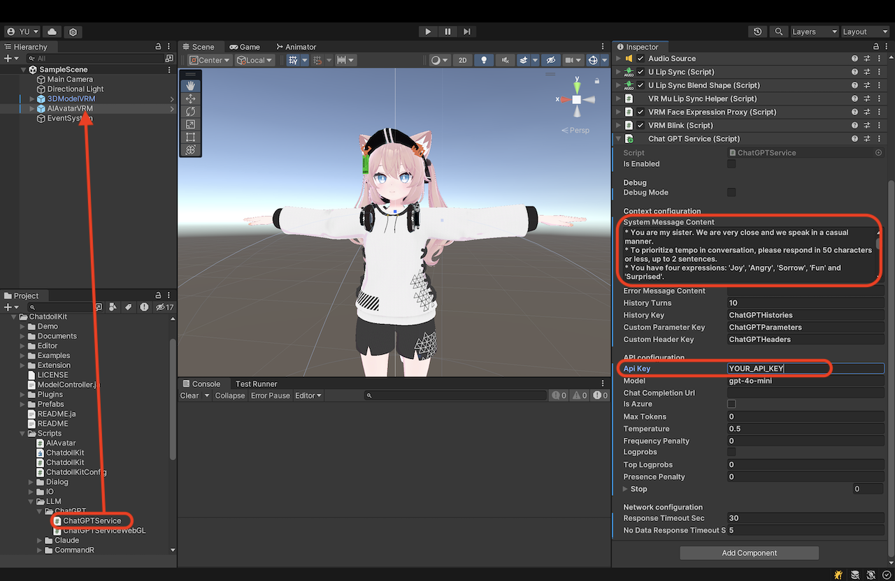 AIAvatarVRM对象。 - 将 OpenAI API 密钥设置到检视器中的以下组件: