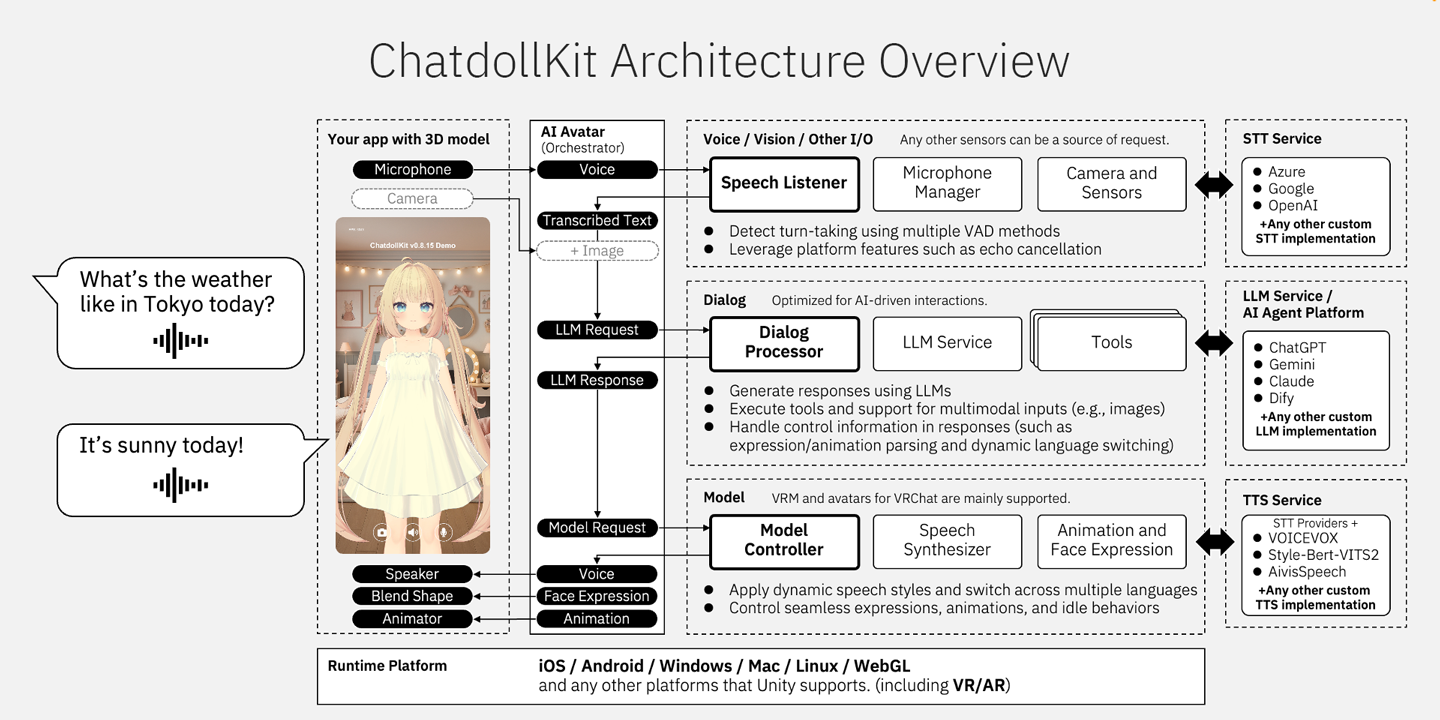 ChatdollKit 通过将复杂的音视频同步与对话管理封装为标准化 SDK,让开发者能专注于内容创作,快速打造出有温度、跨平台的 3D 智能助手。