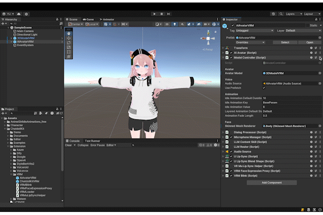 - 一站式快速集成:ChatdollKit 原生支持主流大模型及多种 TTS/STT 服务,自动同步语音与唇形动画,将原本数周的联调工作缩短至几天内完成。