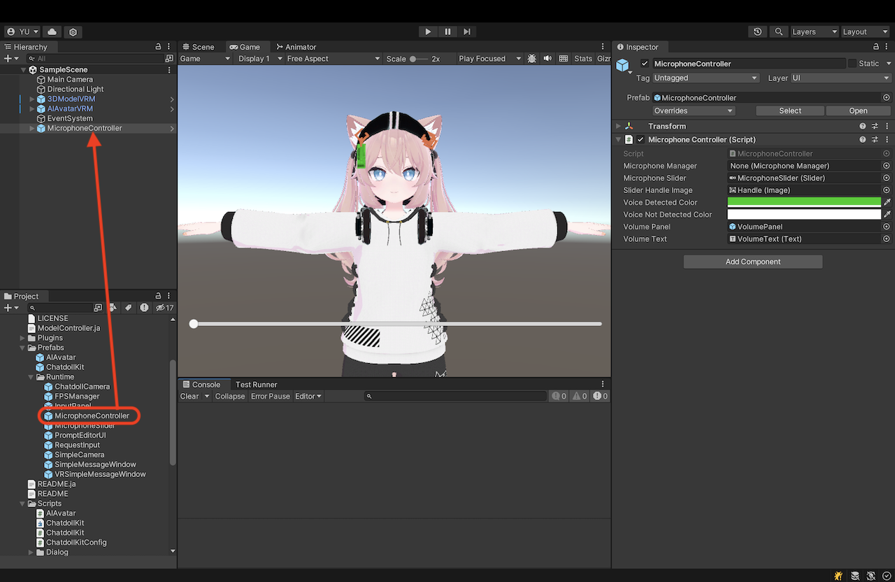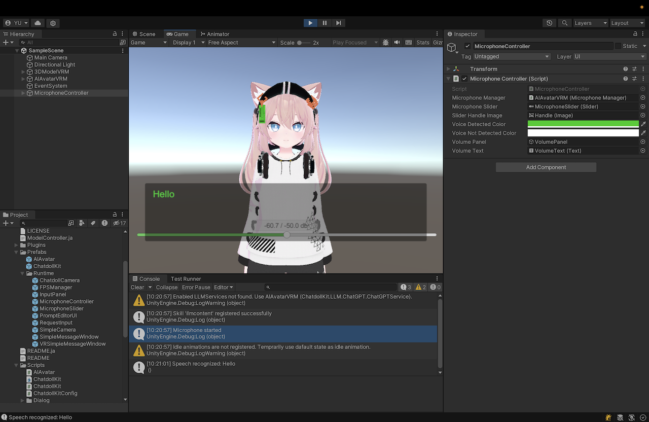ChatdollMicrophone。 - 不支持 MP3 等压缩音频格式。请在 SpeechSynthesizer 中使用 WAV 格式。