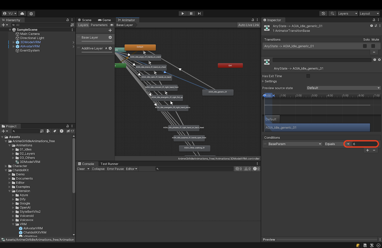 空闲动画会在模型处于等待状态时循环播放。要运行所需的动作,需将其注册到 Animator Controller 的状态机中,并通过在 ModelController 检视器中将参数名称设置为“Idle Animation Key”,将值设置为“Idle Animation Value”,来配置过渡条件。