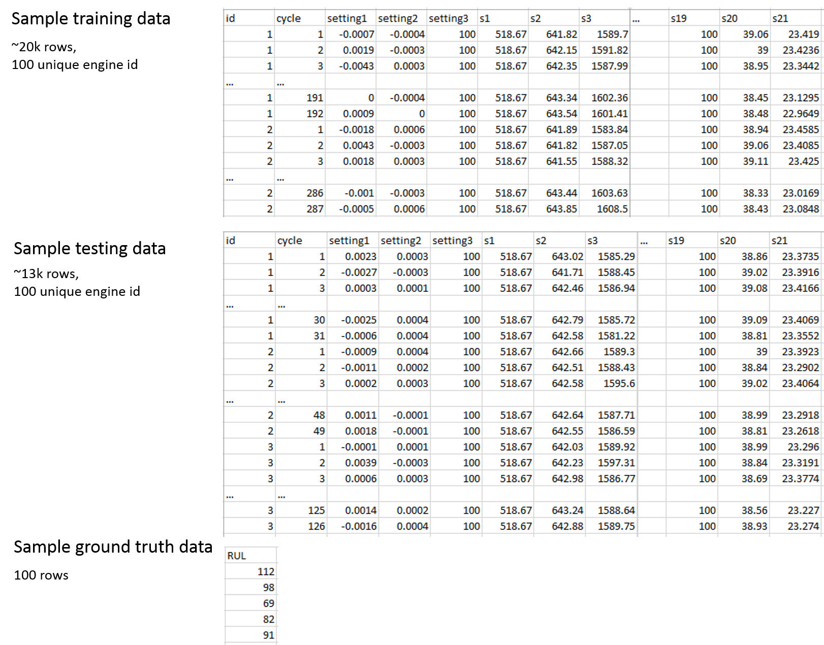 在 Dataset 目录下,包含了训练集、测试集和真实标签数据集。训练数据由“周期”作为时间单位的 多条多变量时间序列 组成,每条序列包含每个周期的 21 个传感器读数。可以假设每条时间序列都来自同一型号的不同发动机。测试数据与训练数据具有相同的数据结构,唯一的区别在于测试数据并未标注故障发生的时间。最后,真实标签数据提供了测试集中各台发动机剩余的工作周期数。 下图展示了部分数据样本: