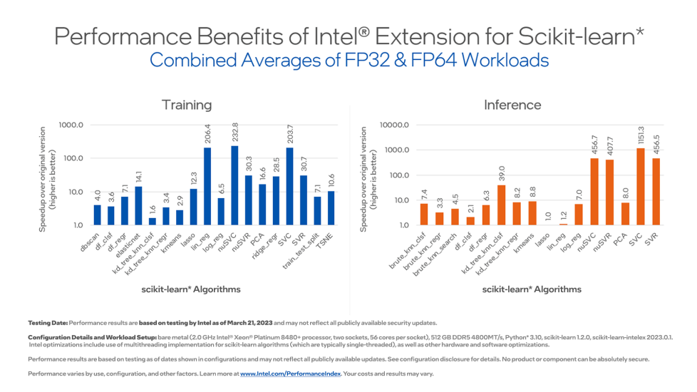 Scikit-learn 扩展是一款 免费的 AI 加速器软件,旨在为您的现有 scikit-learn 代码提供超过 10-100 倍 的加速。这种软件加速是通过向量化指令、针对 AI 硬件的内存优化、多线程以及各种优化技术实现的。