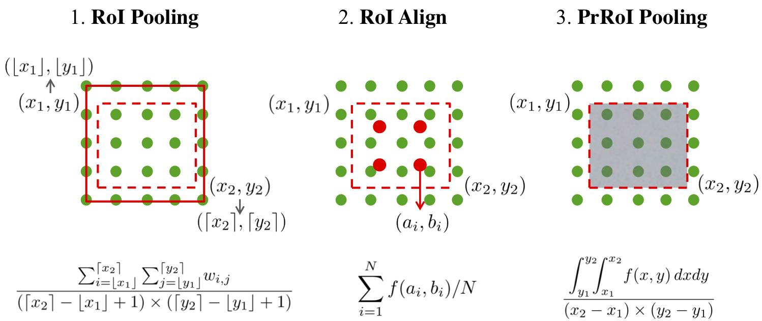 为了更好地说明,我们在下图中对比展示了 RoI 池化、RoI Align 和 PrRoI Pooling。更多细节,包括梯度计算方法,可在我们的论文中找到。