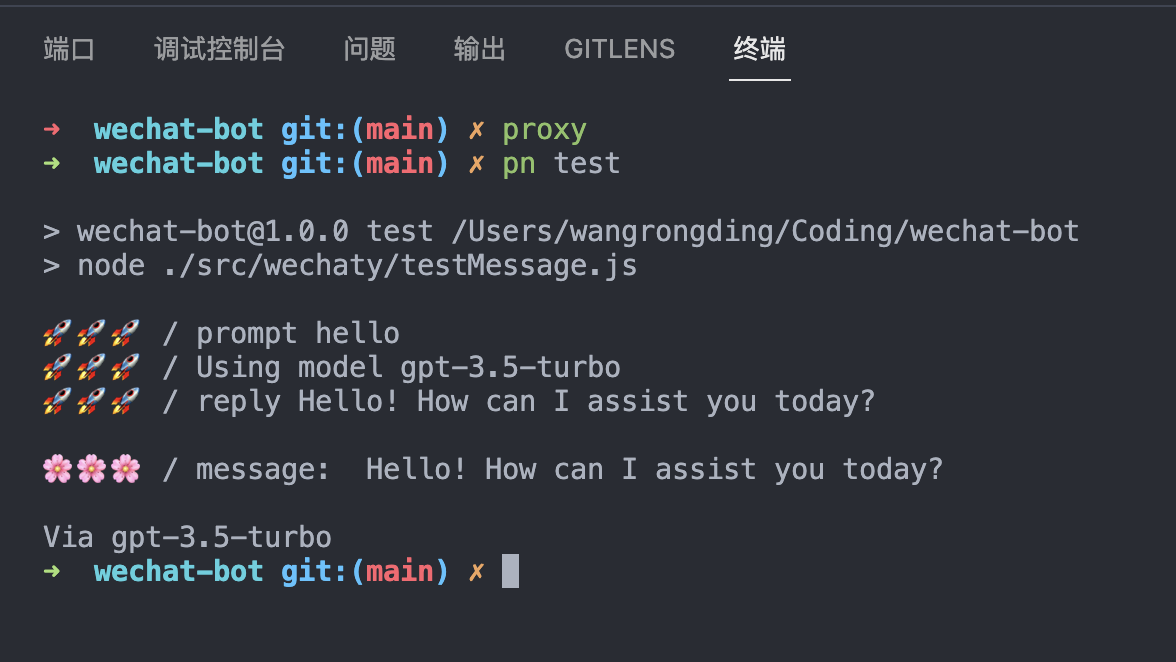 安装完依赖后,运行 npm run dev 前,可以先测试下 openai 的接口是否可用,运行 npm run test 即可。