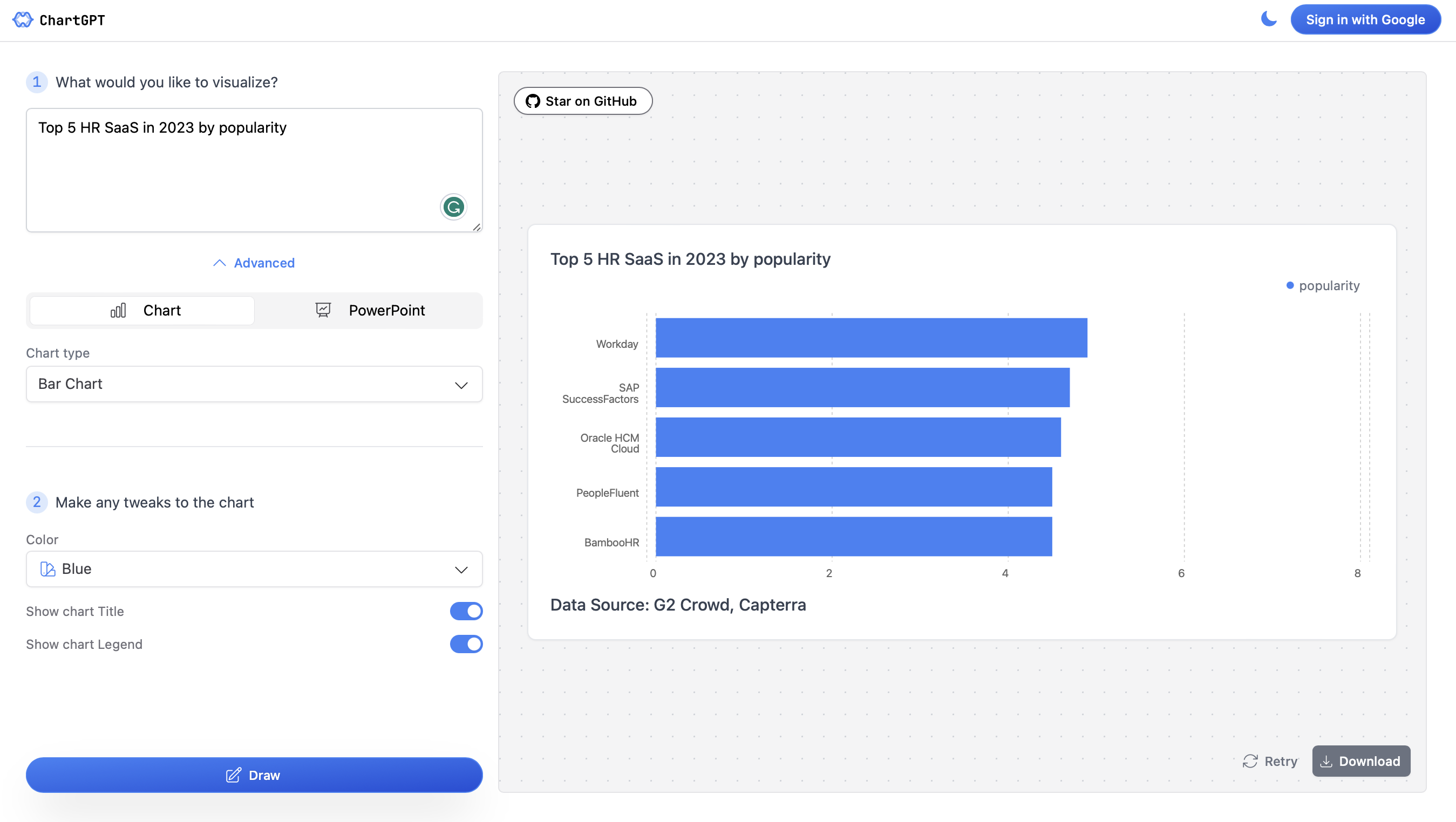 chart-gpt 是一款能将文字描述瞬间转化为精美图表的 AI 开源工具。它主要解决了传统数据可视化过程中门槛高、耗时长的痛点:用户无需掌握复杂的编程代码或繁琐的图表软件操作,只需输入自然的语言指令,即可快速生成直观的数据图形。