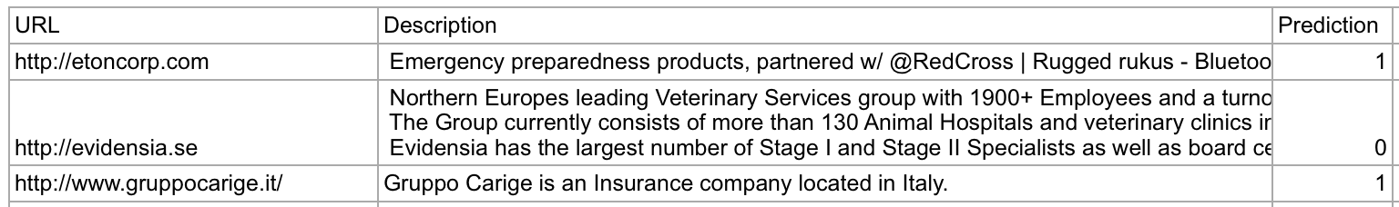 - 利用机器学习模型自动分析公司描述与 URL 特征,秒级完成数百条线索的初筛分类。