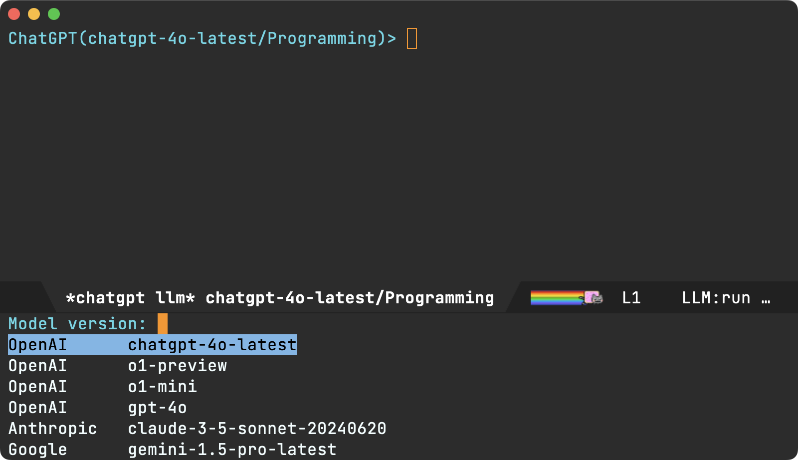 一个 shell 查询所有模型。只需通过 =M-x chatgpt-shell-swap-model= 切换 LLM 提供商,即可继续使用您熟悉的流程。