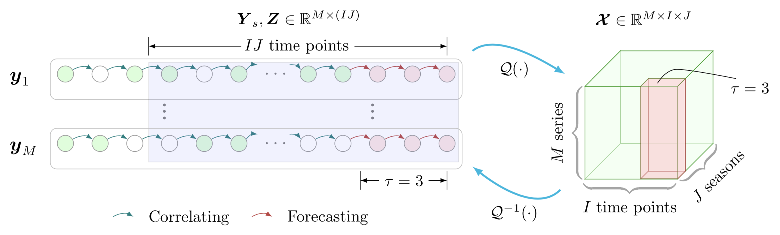 图 3: 我们提出的低秩自回归张量补全(Low-Rank Autoregressive Tensor Completion, LATC)补全器/预测器的示意图(绿色节点:观测值;白色节点:缺失值;红色节点/面板:预测;蓝色面板:用于构建张量的训练数据)。
