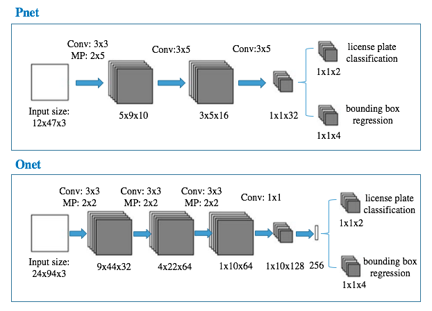 修改后的 MTCNN 结构如下所示。由于实验发现在此任务中跳过 Rnet 并不会影响精度,因此本项目仅使用了提案网络(Pnet)和输出网络(Onet)。Onet 接受 24(高)× 94(宽)的 BGR 图像,这与 LPRNet 的输入尺寸一致。
