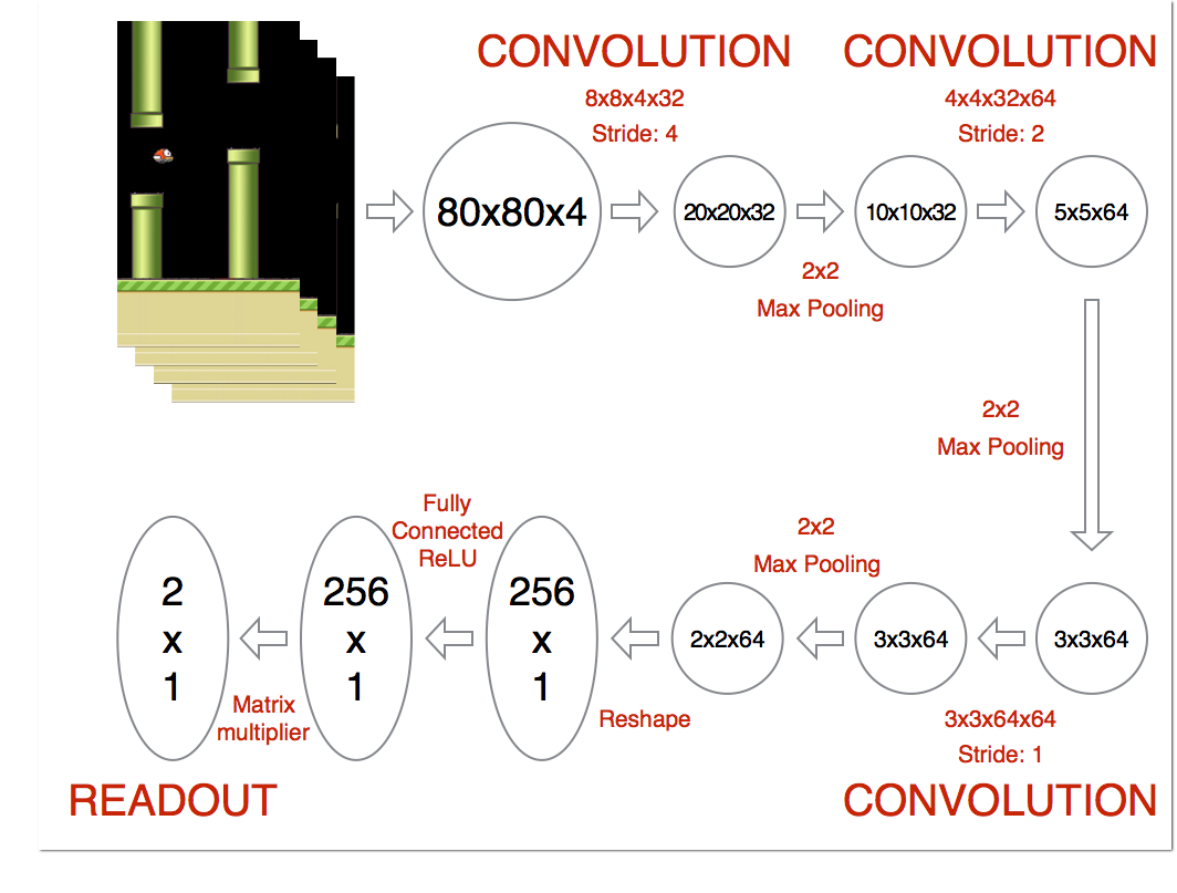 网络的架构如图所示。第一层使用一个8x8x4x32的卷积核,步长为4,对输入图像进行卷积。然后将输出送入一个2x2的最大池化层。第二层使用一个4x4x32x64的卷积核,步长为2。随后再次进行最大池化。第三层使用一个3x3x64x64的卷积核,步长为1。最后再进行一次最大池化。最后一层隐藏层包含256个全连接的ReLU节点。