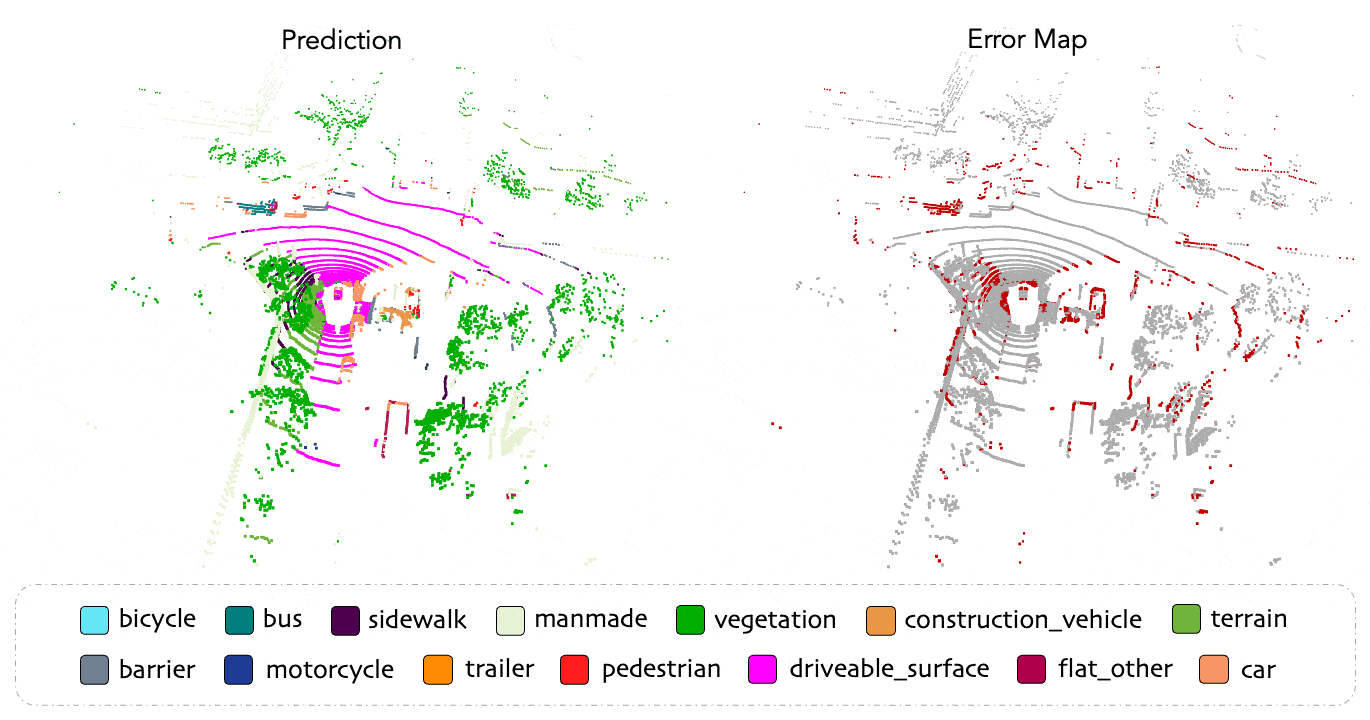 | 我们 Seal :seal: 框架在 nuScenes 数据集上预训练(未使用真值标签),并使用冻结的主干网络和线性分类头进行线性探测后的定性结果。为突出差异,正确/错误的预测分别以灰色/红色标注。 |