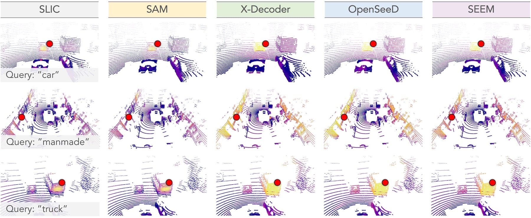 | 在我们的 Seal :seal: 框架中,查询点(红点)与使用 SLIC 和不同视觉基础模型学习到的特征之间的余弦相似度。从上到下示例中的查询语义类别分别为:“汽车”、“人造物”和“卡车”。颜色由紫色渐变至黄色,分别表示低和高的相似度分数。 |