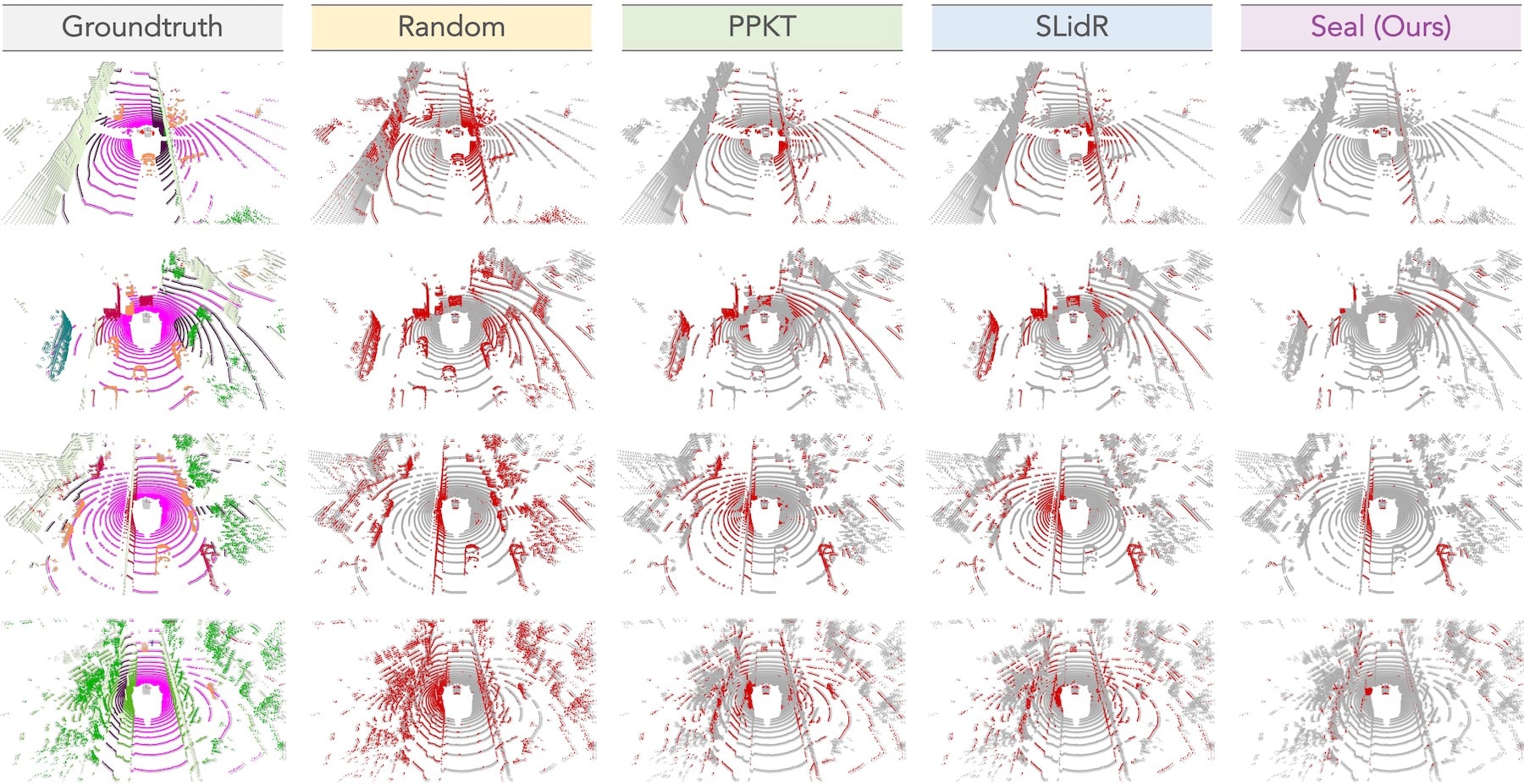 | Seal :seal: 与先前在 nuScenes 上预训练(未使用真实标签)并用 1% 标注数据微调的方法的定性结果。为了突出差异,正确/错误的预测分别以灰色/红色标出。 |