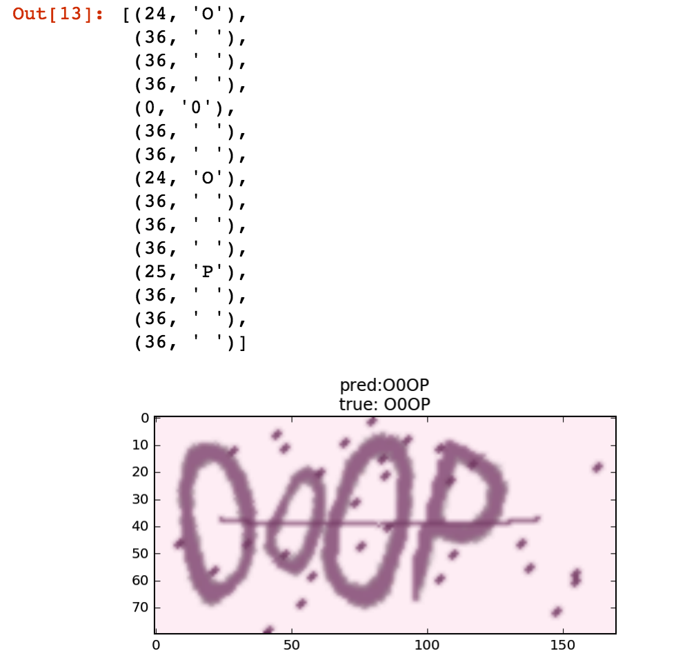 我们会通过这个函数来评估我们的模型,和上面的评估标准一样,只有全部正确,我们才算预测正确,中间有个坑,就是模型最开始训练的时候,并不一定会输出四个字符,所以我们如果遇到所有的字符都不到四个的时候,就不计算了,相当于加0,遇到多于4个字符的时候,只取前四个。