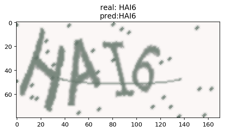 plt.title('real: %s\npred:%s'%(random_str, out))