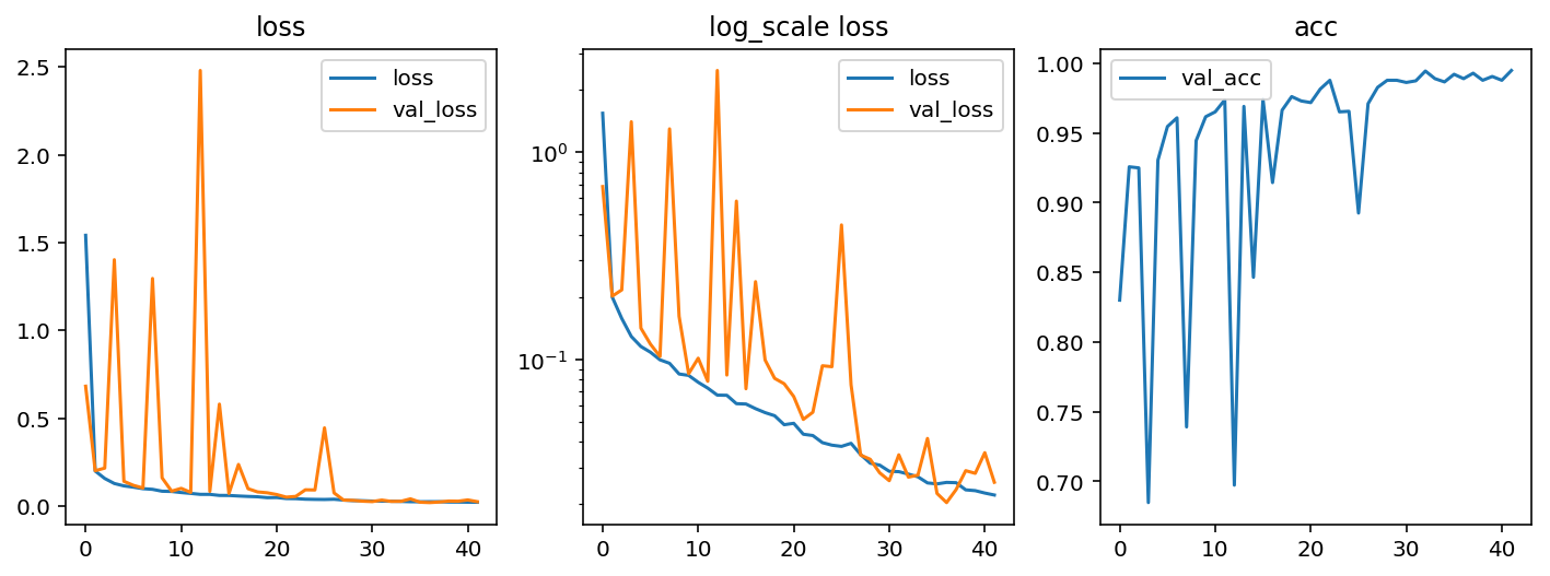 可以看到 loss 一开始下降很快,后面就很平了,但是我们把在对数尺度下绘制 loss 图的话,还是能看到 loss 一直在下降的。acc 上升得也很快,虽然前期训练的时候 acc 很抖动,但是后期学习率降下来以后就不会再跌下来了。