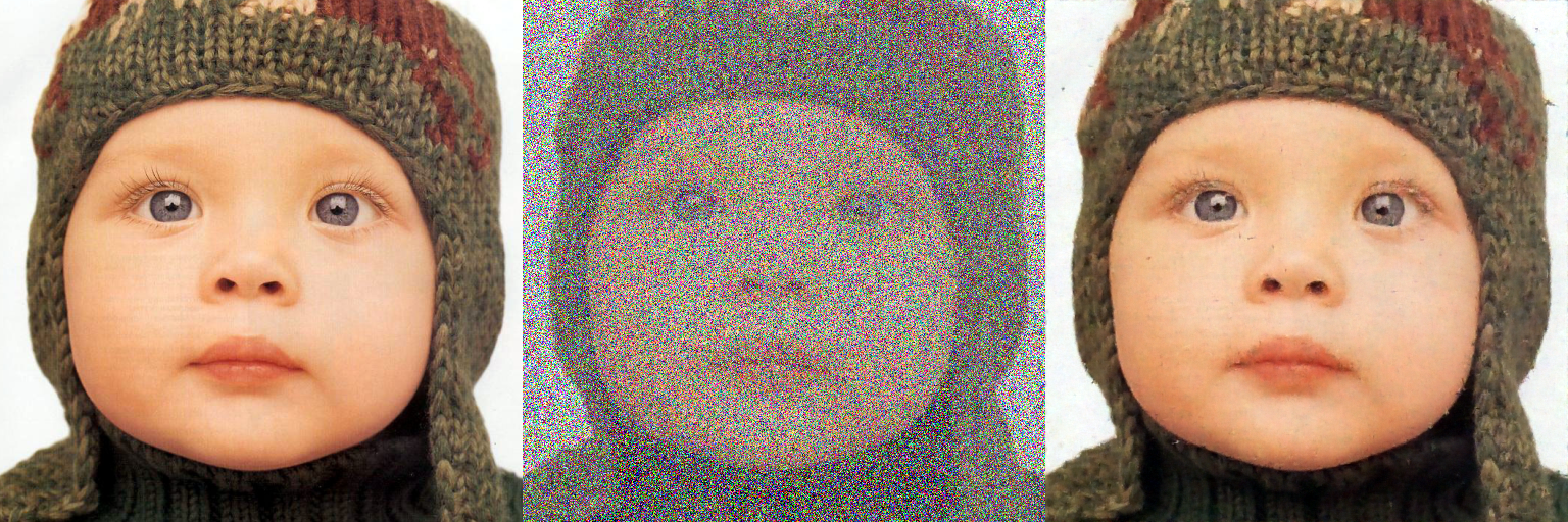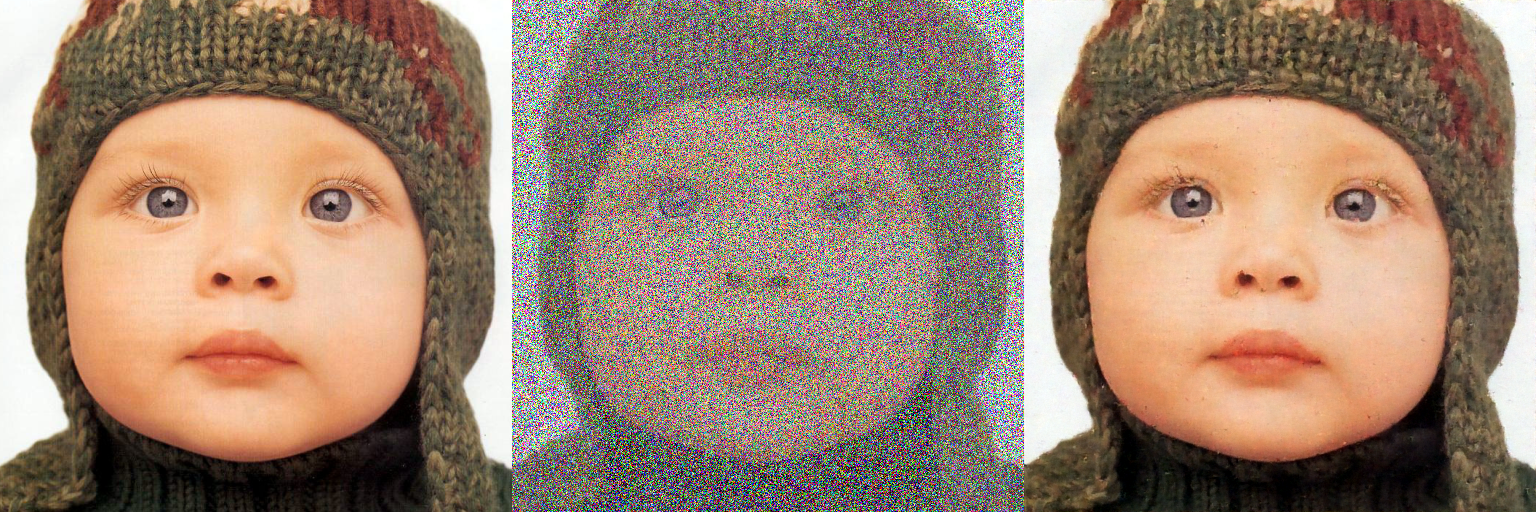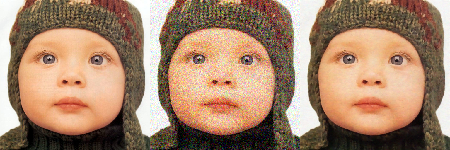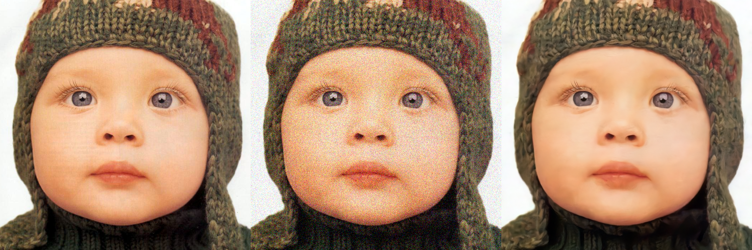 由干净目标模型去噪的结果(从左到右:原图、退化图像、去噪图像):