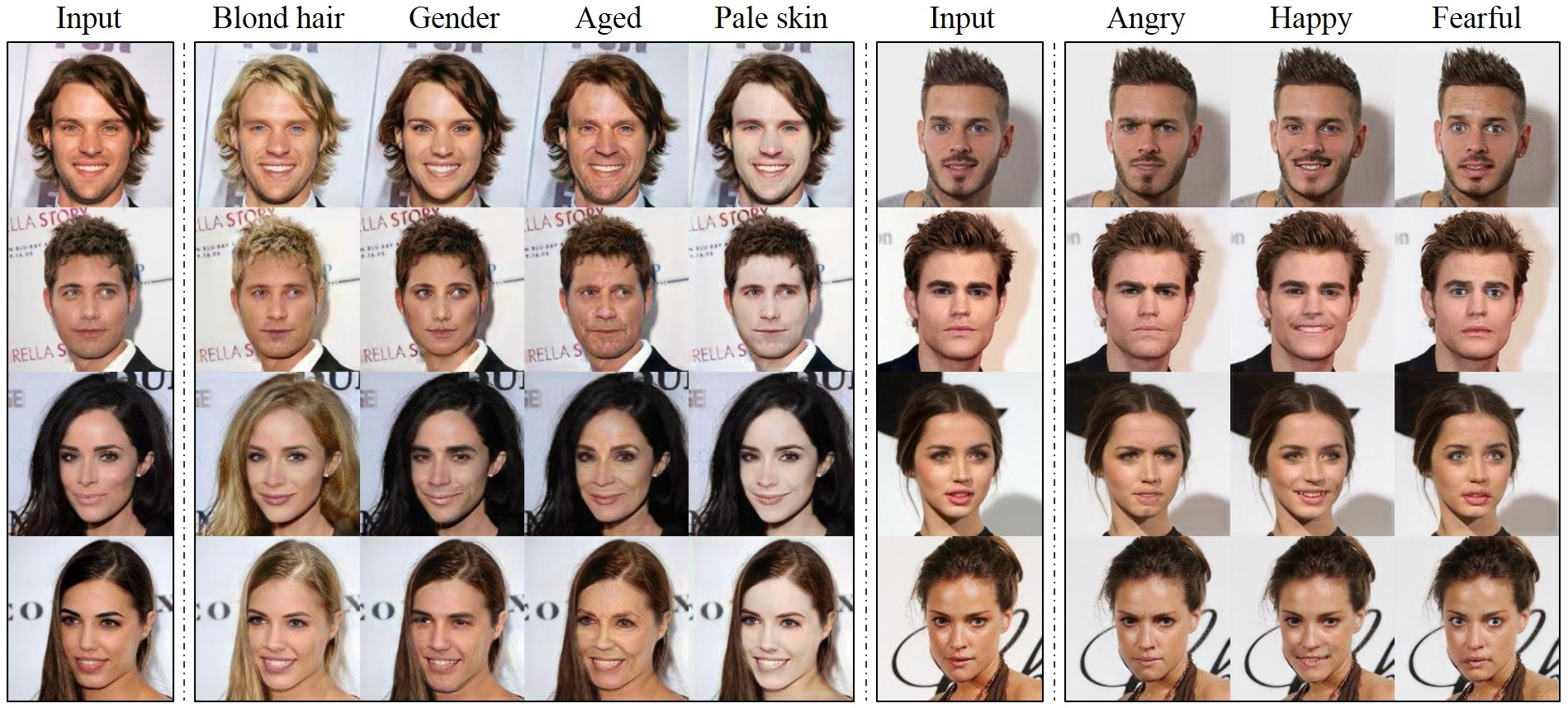 - 单一模型统管全局:仅需训练一个 StarGAN 模型,即可通过调整标签参数同时实现黑发、金发、男性化、年轻化等五种以上属性的自由切换,大幅简化部署架构。