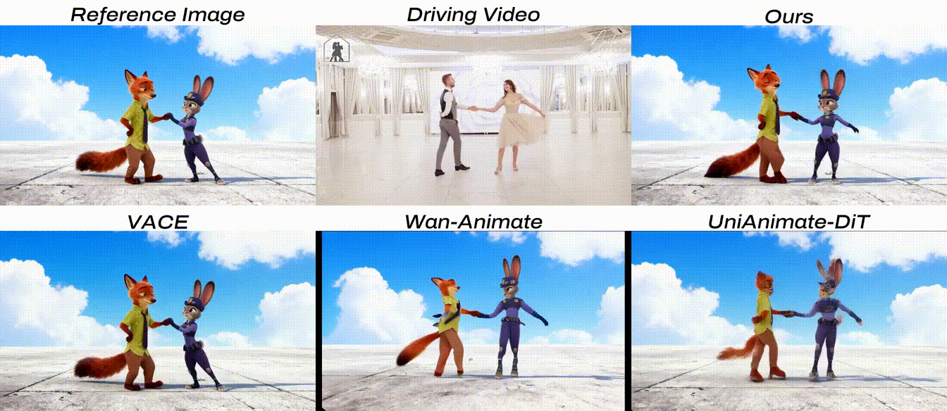 传统动画生成模型常面临两大痛点:难以泛化到不同角色,以及在复杂场景(如多人交互、翻滚转身)中动作不连贯。SCAIL 通过创新的“上下文学习”机制和"3D 一致性姿态表示”,巧妙解决了姿态信息注入时容易泄露角色身份或丢失运动细节的难题。它迫使模型对整个运动序列进行时空推理,从而生成更加自然流畅的动作。值得一提的是,SCAIL 展现出惊人的泛化能力,即使未经过动物数据训练,也能驱动四足生物,甚至能理解二维手绘角色的三维空间关系。